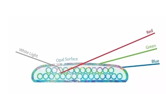 因為歐泊由非常微小的硅球緊密排列組成,當光線照射進入後,硅球的縫隙使光線產生衍射(如圖)