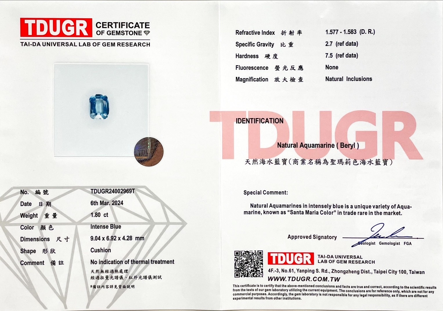 海水藍寶|Aquamarine▴ 重量:1.80ct (9.04*6.92*4.28mm)▴ 處理:無處理| No treatment▴ 顏色:聖瑪莉色|Santa Maria▴ 證書:TDUGR證書