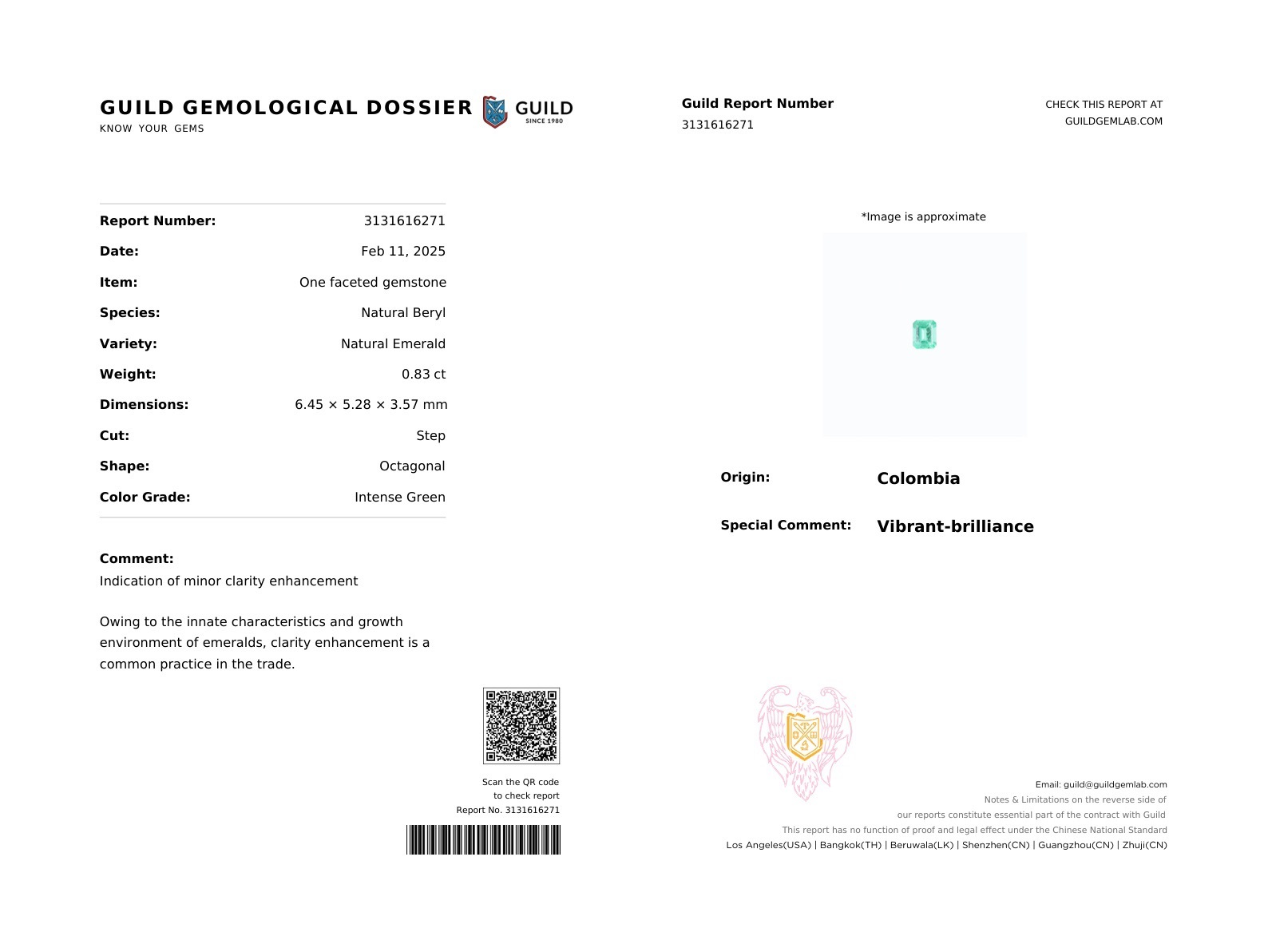 祖母綠|Emerald▴ 重量:0.83ct (6.45*5.28*3.57mm)▴ 產地:哥倫比亞| Colombia▴ 證書: GUILD證書|國際證書▴ 處理:輕度浸油處理| CEE(O)Minor
