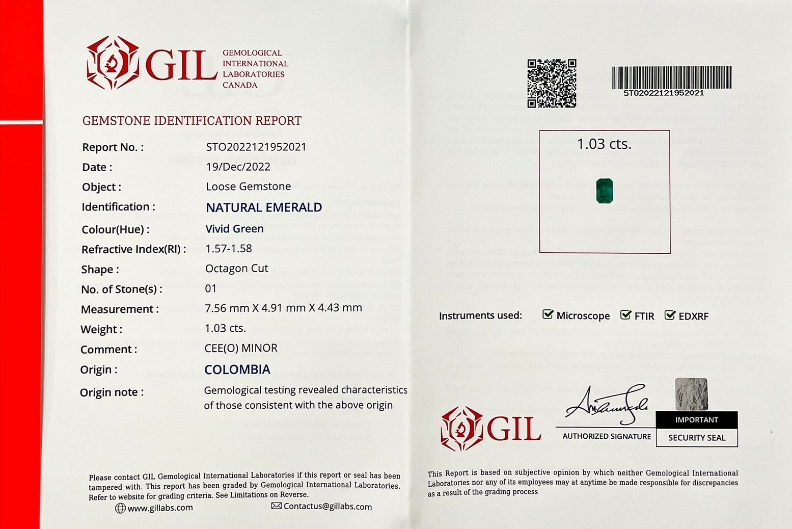 祖母綠|Emerald▴ 重量:1.03ct (7.56*4.91*4.43mm)▴ 產地:哥倫比亞| Colombia▴ 證書: GIL證書|國際證書▴ 處理:輕度浸油處理| CEE(O)Minor