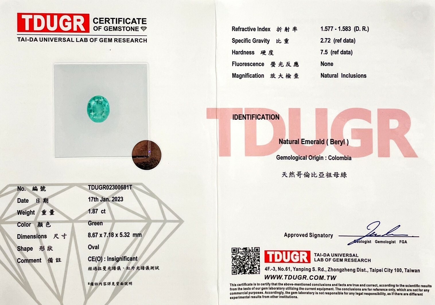 祖母綠|Emerald▴ 重量:1.87ct (8.67*7.18*5.32mm)▴ 產地:哥倫比亞| Colombia▴ 證書:TDUGR證書▴ 處理:極微油處理| CE(O)Insignificant