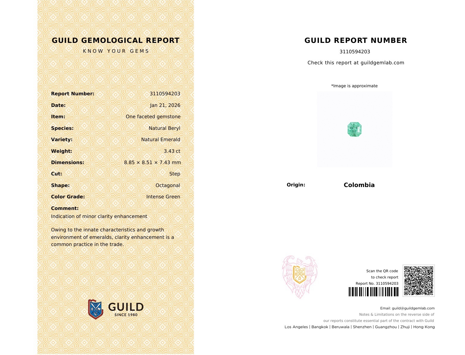 祖母綠|Emerald▴ 重量:3.43ct (8.85*8.51*7.43mm)▴ 產地:哥倫比亞| Colombia▴ 證書:GUILD國際證書▴ 處理:輕度浸油處理| CE(O)Minor
