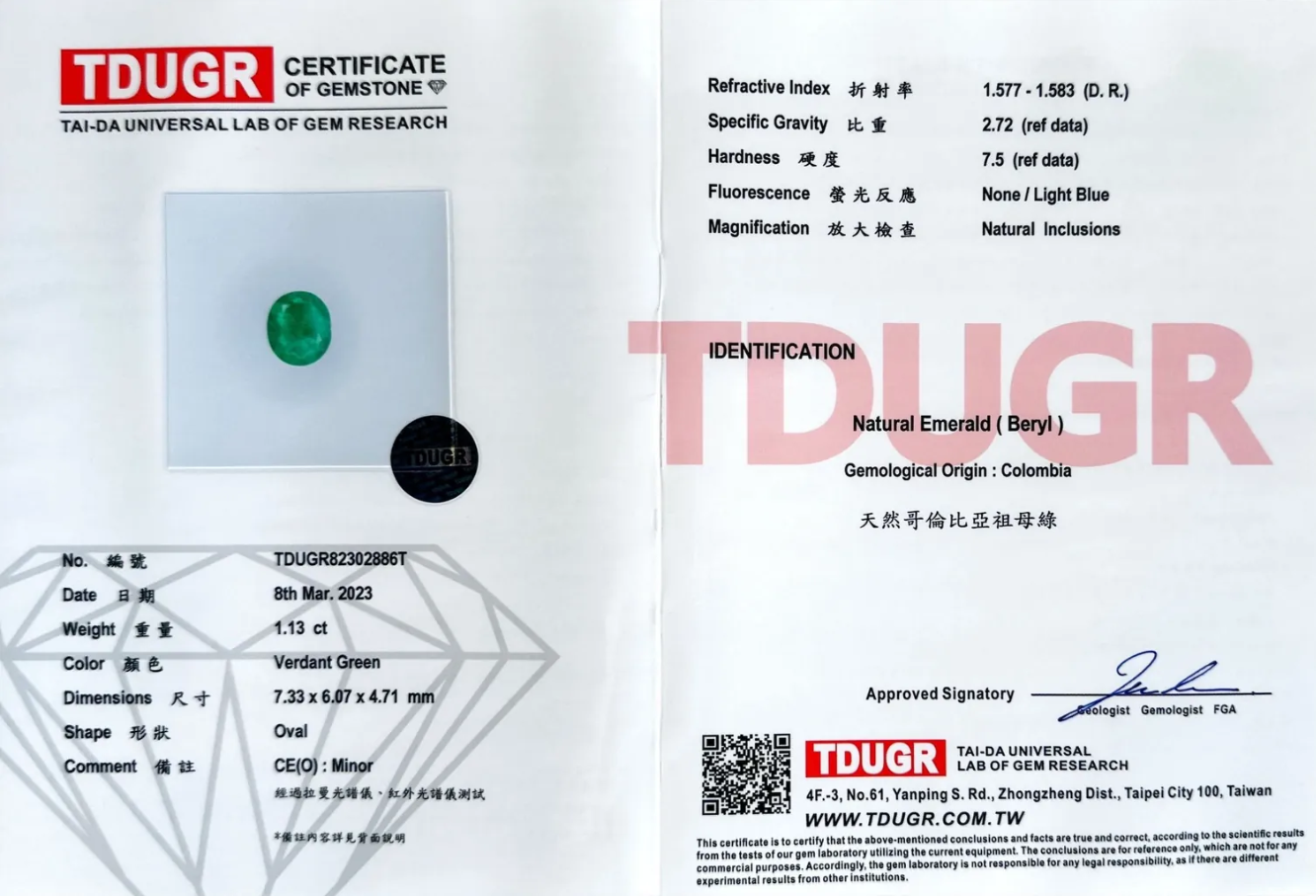 祖母綠|Emerald▴ 重量:1.13ct (7.33*6.07*4.71mm)▴ 產地:哥倫比亞| Colombia▴ 證書:TDUGR證書▴ 處理:輕度浸油處理| CE(O)Minor