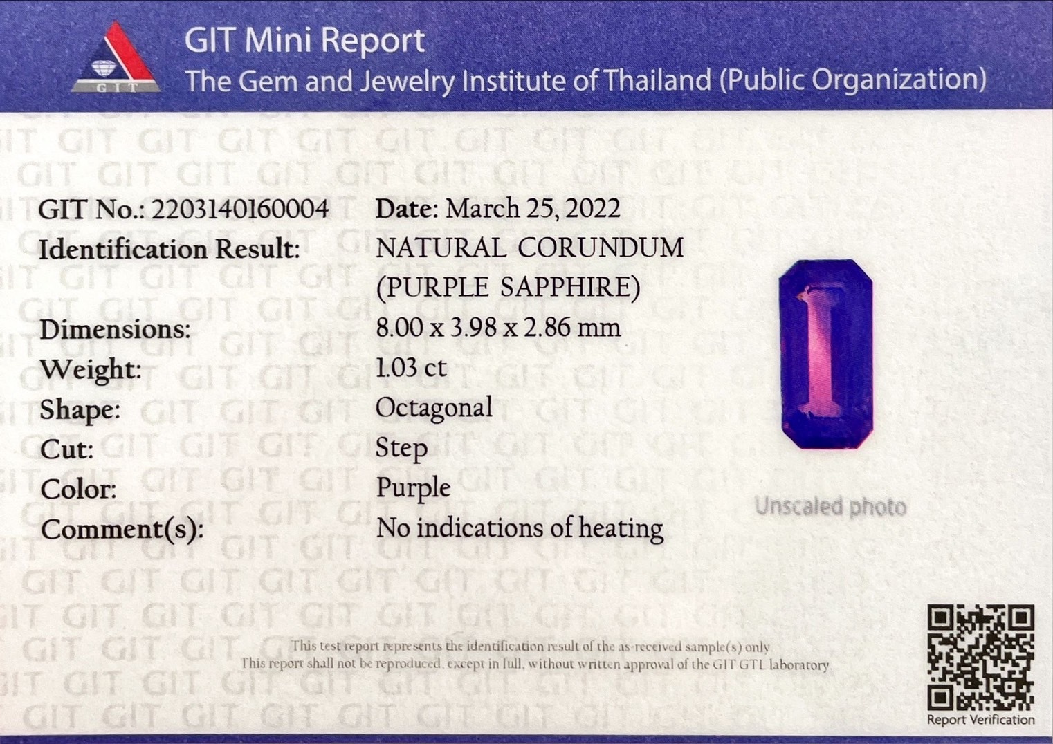 紫藍寶石|Sapphire▴ 重量:1.03ct (8.00*3.98*2.86mm)▴ 顏色:紫色