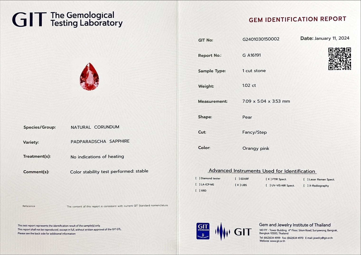 帕帕拉洽|Padparadscha▴ 重量:1.02ct (7.09*5.04*3.53mm)▴ 證書:GIT證書|國際證書