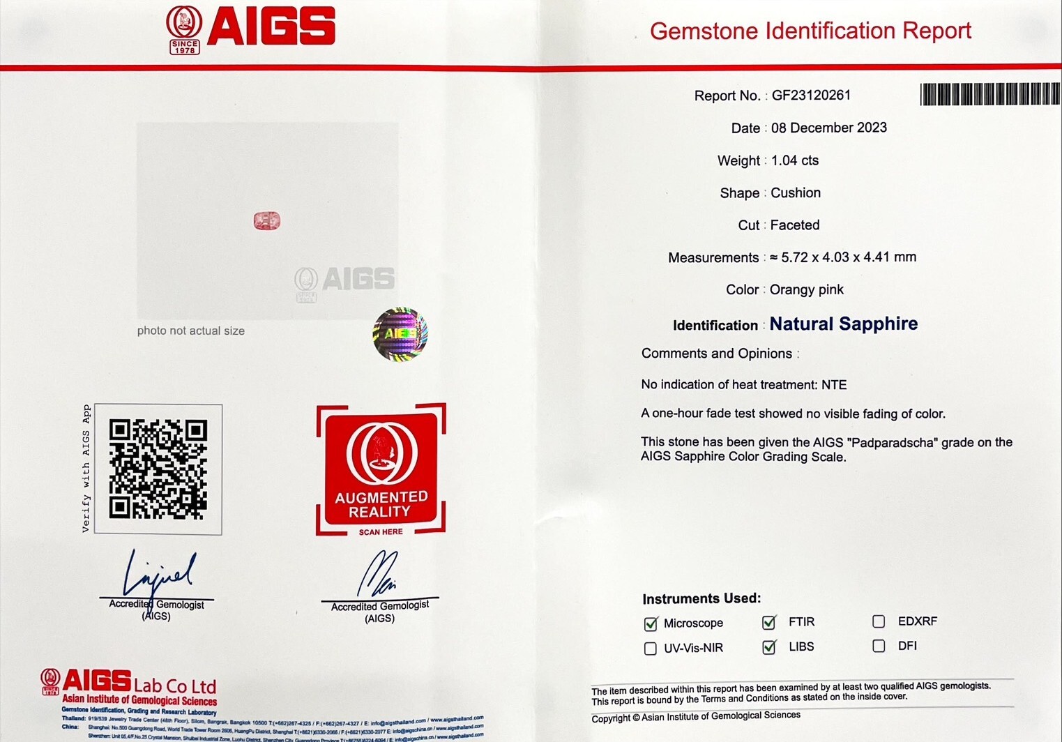 帕帕拉洽|Padparadscha▴ 重量:1.04ct (5.72*4.03*4.41mm)▴ 證書:AIGS|國際證書