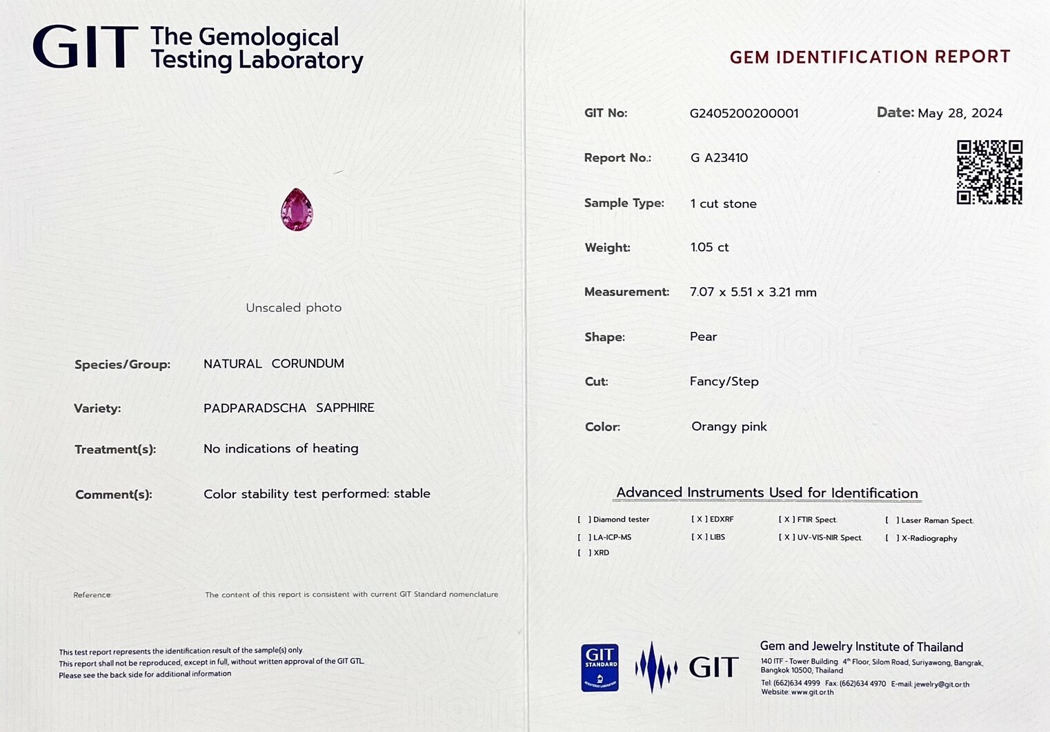 帕帕拉洽|Padparadscha▴ 重量:1.05ct (7.07*5.51*3.21mm)▴ 證書:GIT證書