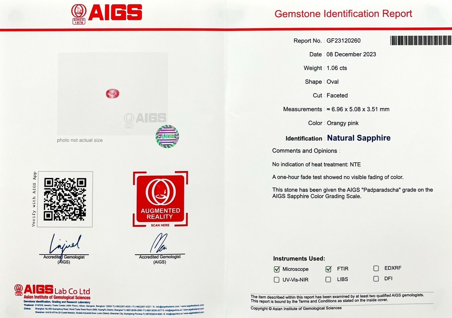 帕帕拉洽|Padparadscha▴ 重量:1.06ct (6.96*5.08*3.51mm)▴ 證書:AIGS證書|國際證書