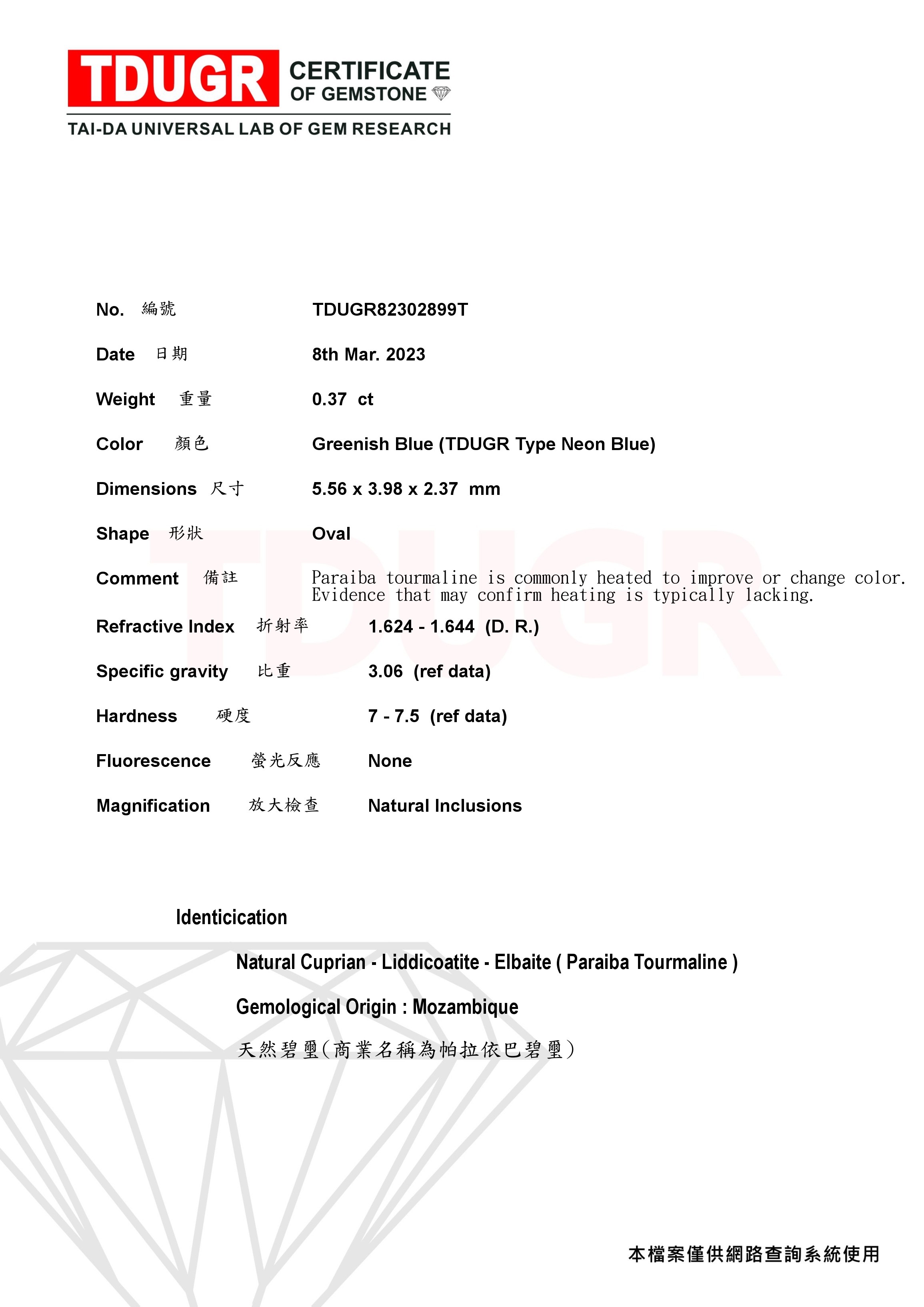 帕拉伊巴|Paraiba▴ 重量:0.37ct (5.56*3.98*2.37mm)▴ 證書:TDUGR證書