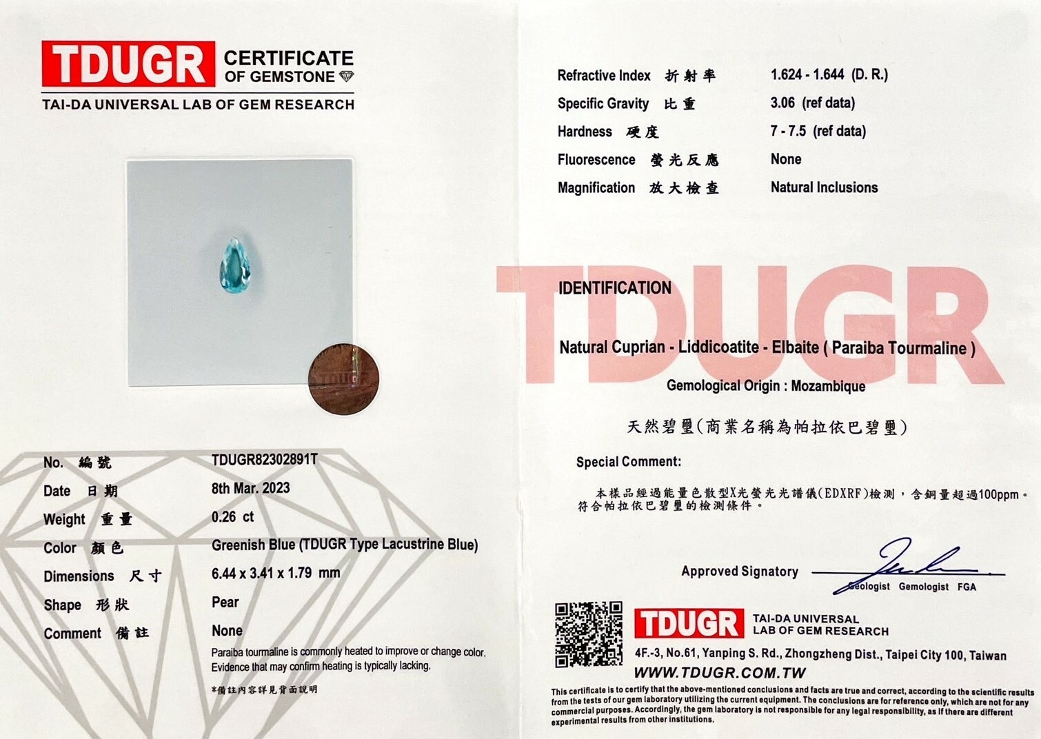帕拉伊巴|Paraiba▴ 重量:0.26ct (6.44*3.41*1.79mm)▴ 證書:TDUGR證書