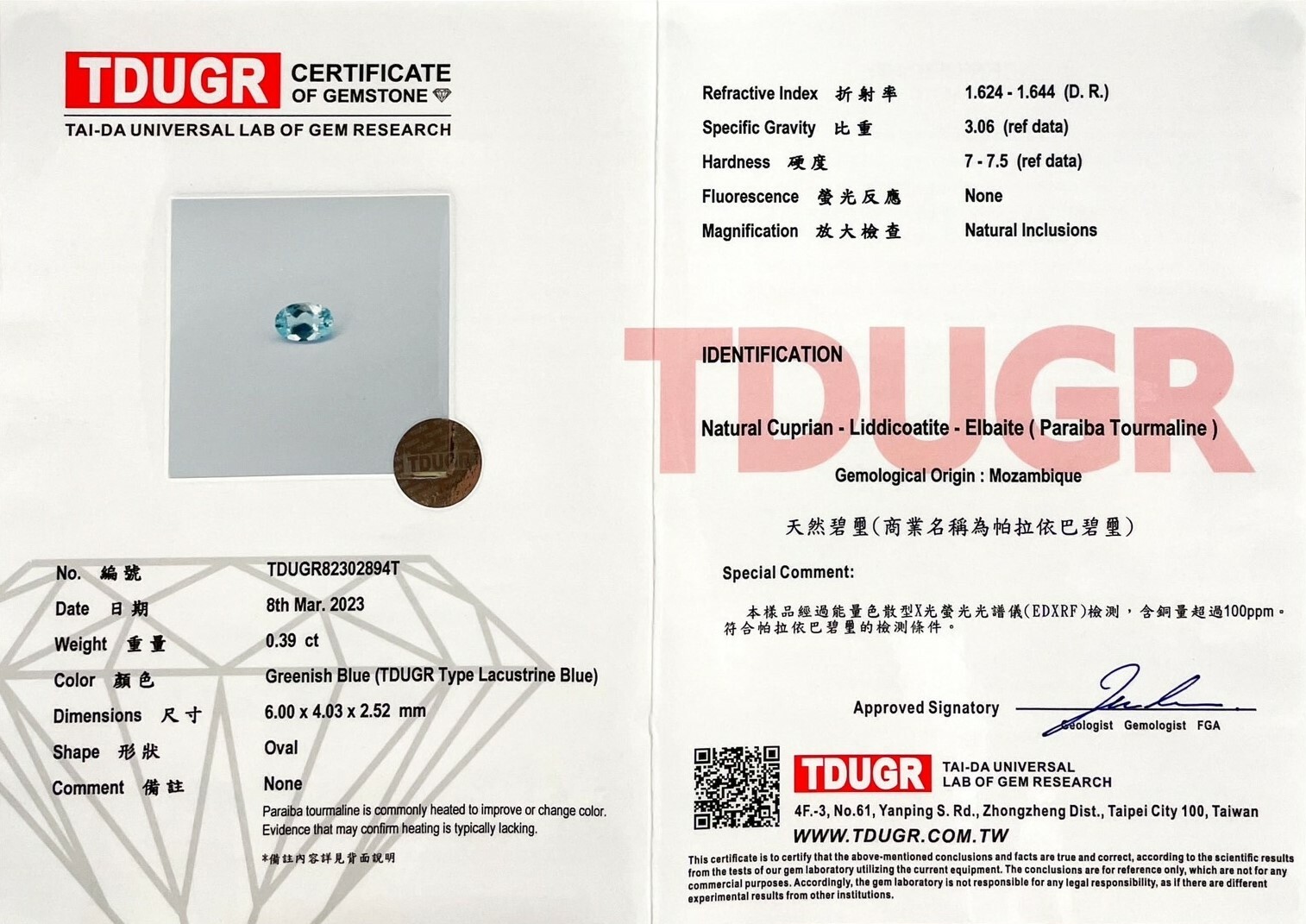 帕拉伊巴|Paraiba▴ 重量: 0.39ct (6.00*4.03*2.52mm)▴ 證書:TDUGR證書