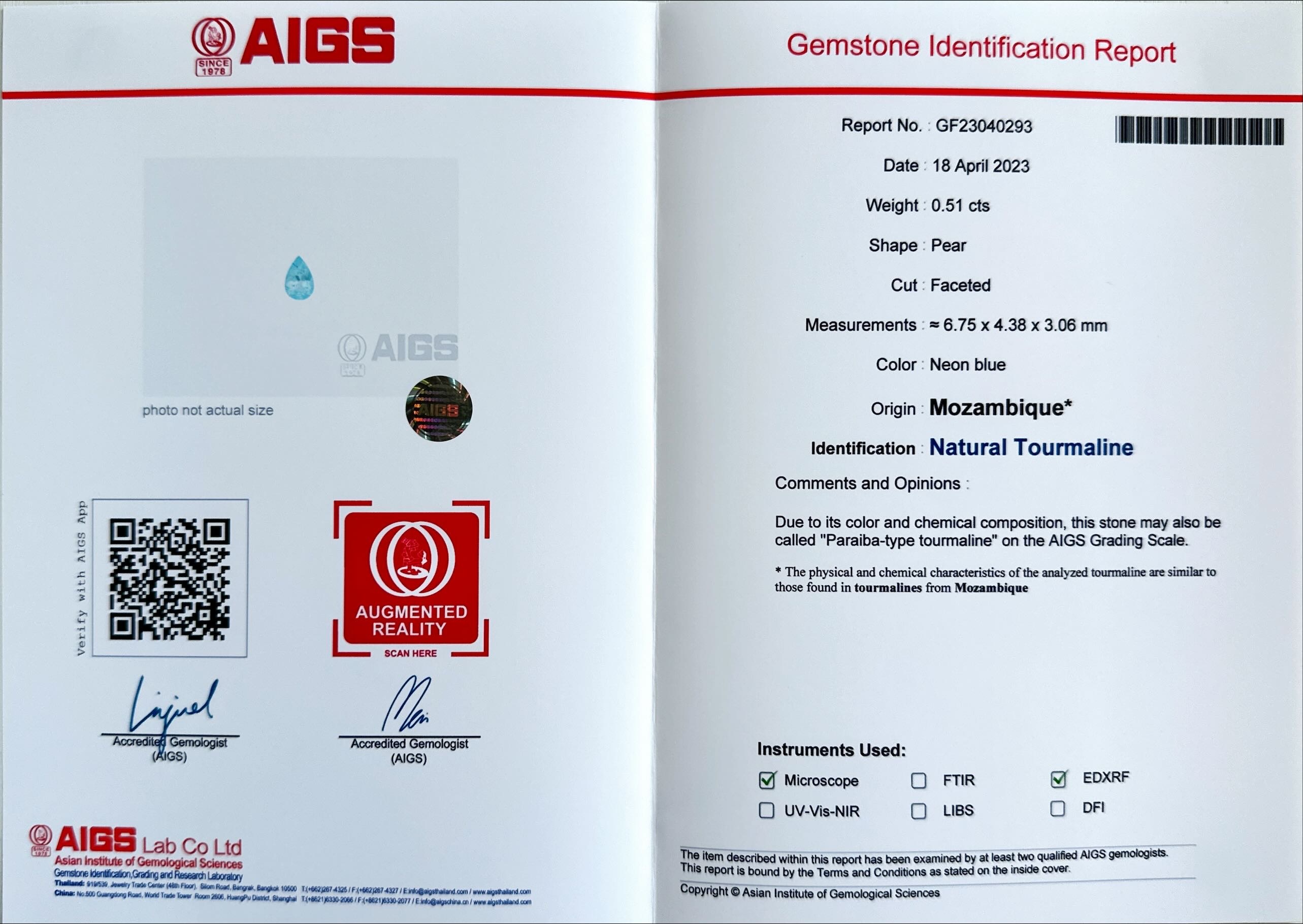 帕拉伊巴|Paraiba▴ 重量:0.51ct (6.75*4.38*3.06mm)▴ 證書:AIGS證書|國際證書