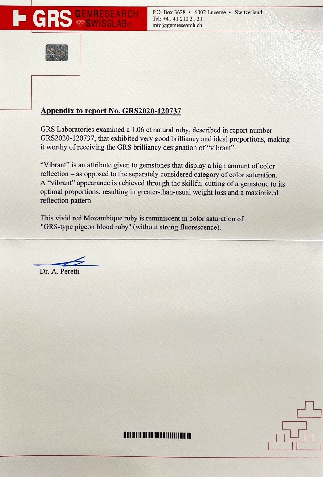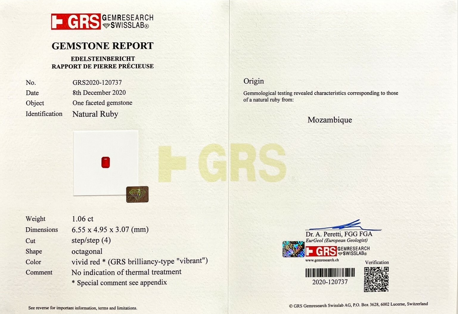 紅寶石|Ruby▴ 重量:1.06ct (6.55*4.95*3.07mm)▴ 顏色:艷紅| Vibrant▴ 證書:GRS證書|國際證書▴ 處理:無處理| No treatment▴ 產地:莫三比克|Mozambique