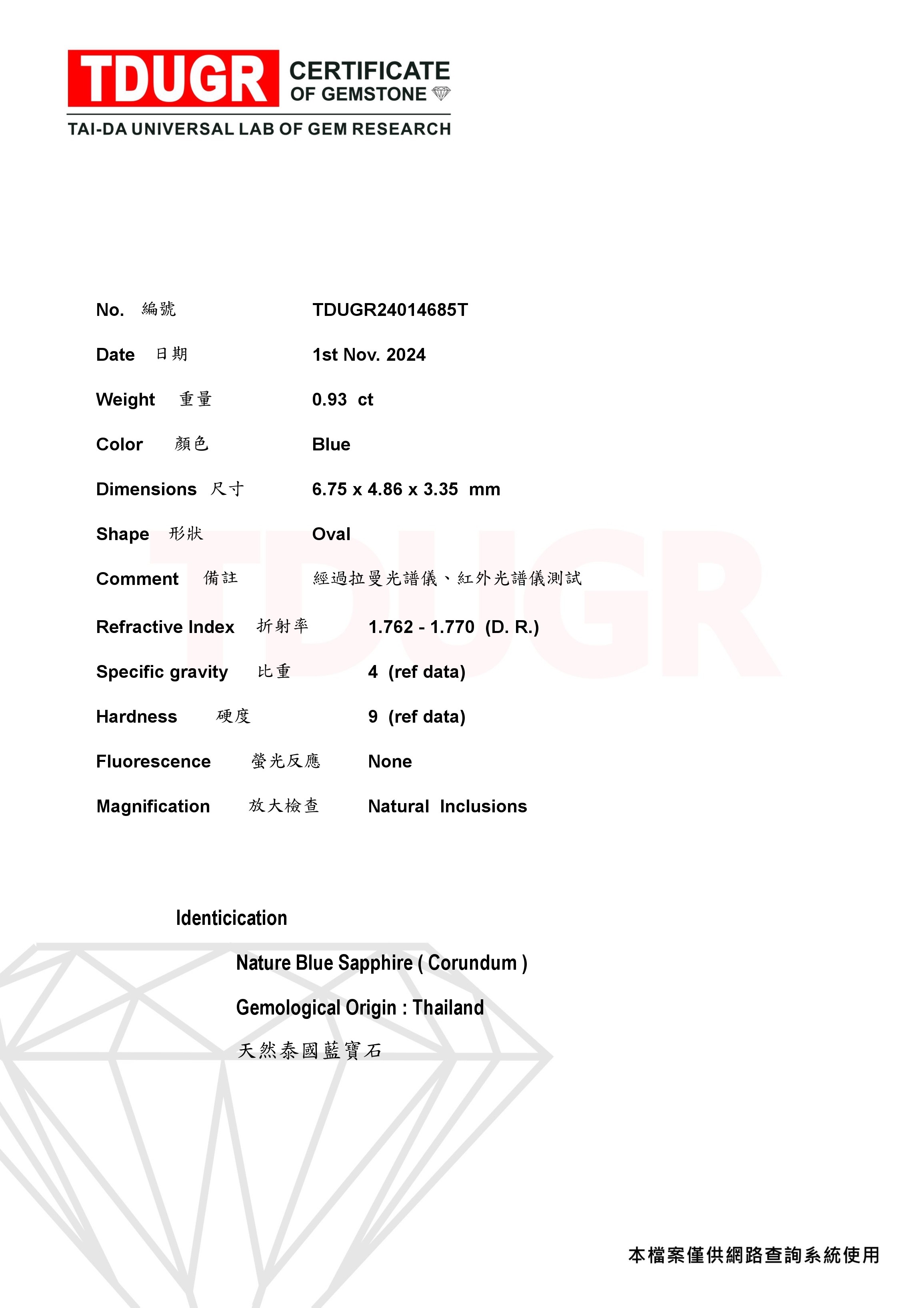 藍寶石|Sapphire▴ 重量:0.93ct (6.72*5.04*2.99mm)▴ 證書:TDUGR證書▴ 處理:熱處理| Heat treatment▴ 產地:泰國