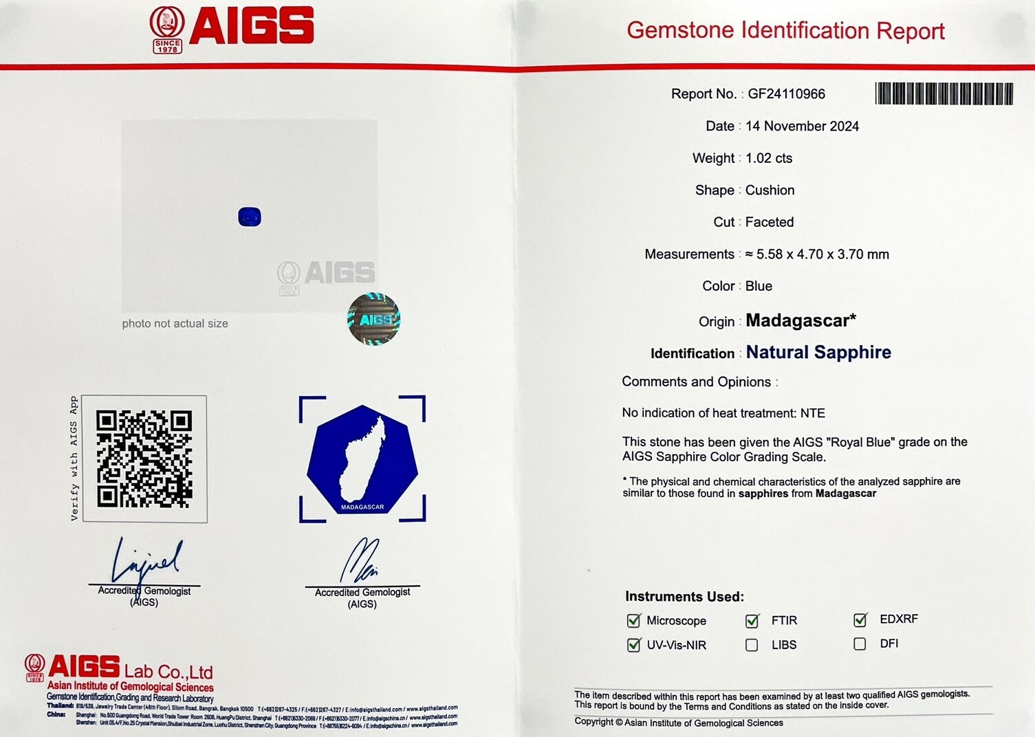 藍寶石|Sapphire▴ 重量:1.02ct (5.58*4.70*3.70mm)▴ 證書:AIGS國際證書▴ 處理:無處理| No treatment▴ 產地:馬達加斯加▴ 顏色:皇家藍 Royal Blue