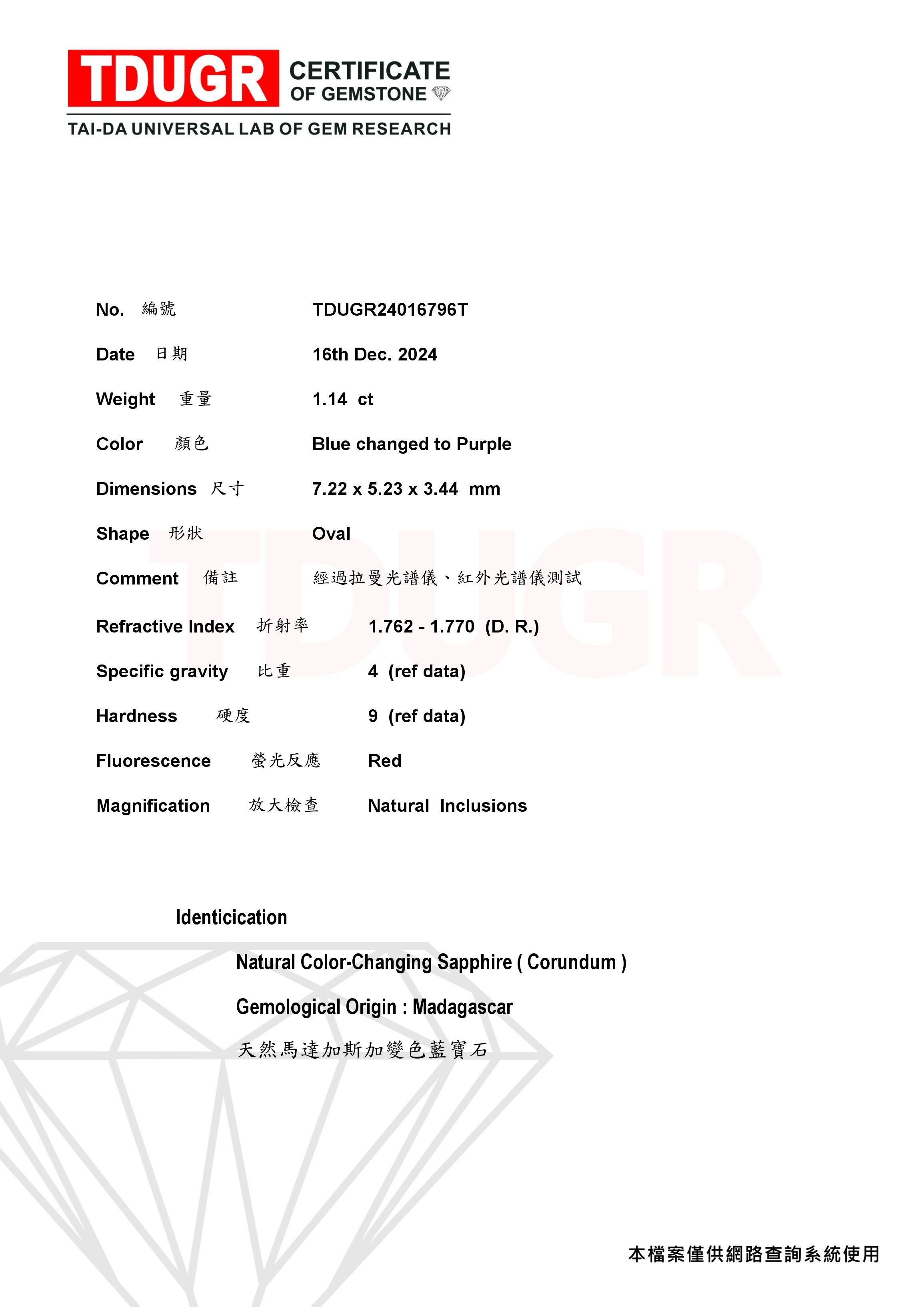 藍寶石|Sapphire▴ 重量:1.14ct (7.22*5.23*3.44mm)▴ 證書:TDUGR證書▴ 處理:熱處理| Heat treatment▴ 產地:馬達加斯加