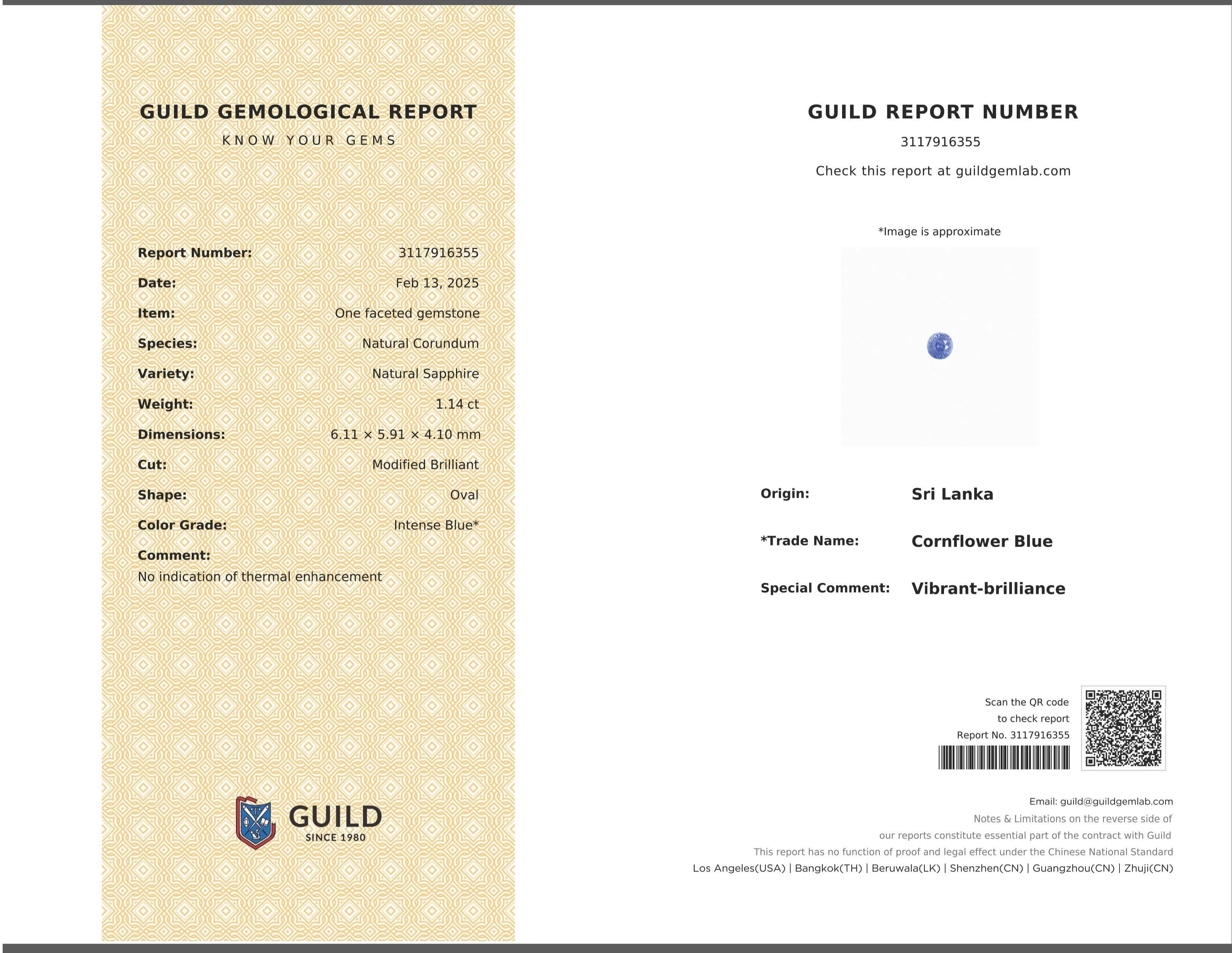 藍寶石|Sapphire▴ 重量:1.14ct (6.11*5.91*4.10mm)▴ 證書:GUILD國際證書▴ 處理:無處理| No treatment▴ 產地:斯里蘭卡▴ 顏色:矢車菊 Cornflower