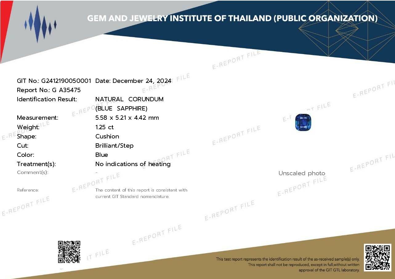 藍寶石|Sapphire▴ 重量:1.25ct (5.58*5.21*4.42mm)▴ 證書:GIT小證▴ 處理:無處理| No treatment