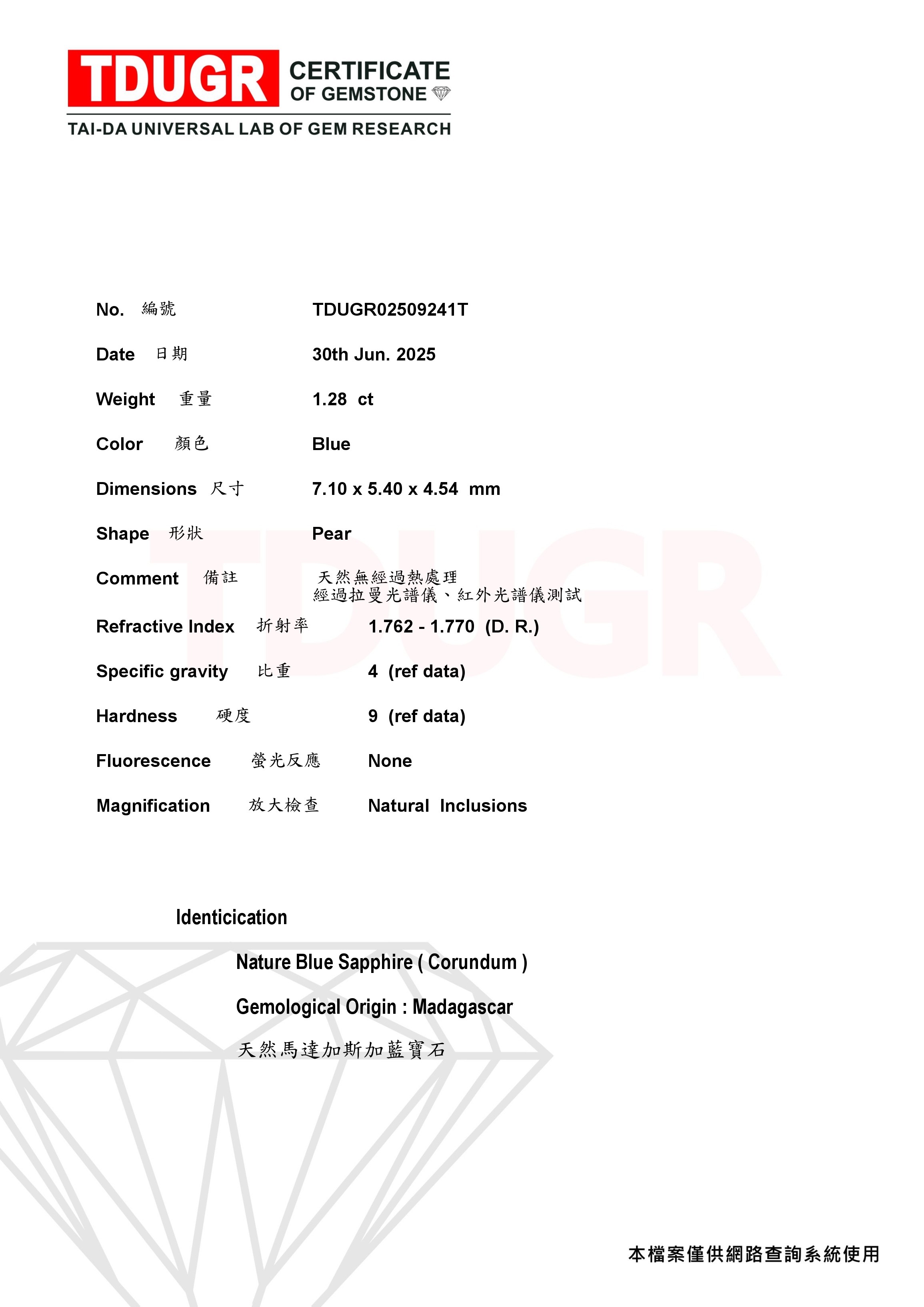 藍寶石|Sapphire▴ 重量:1.28ct (7.10*5.40*4.54mm)▴ 證書:TDUGR證書▴ 處理:無處理| No treatment▴ 產地:馬達加斯加