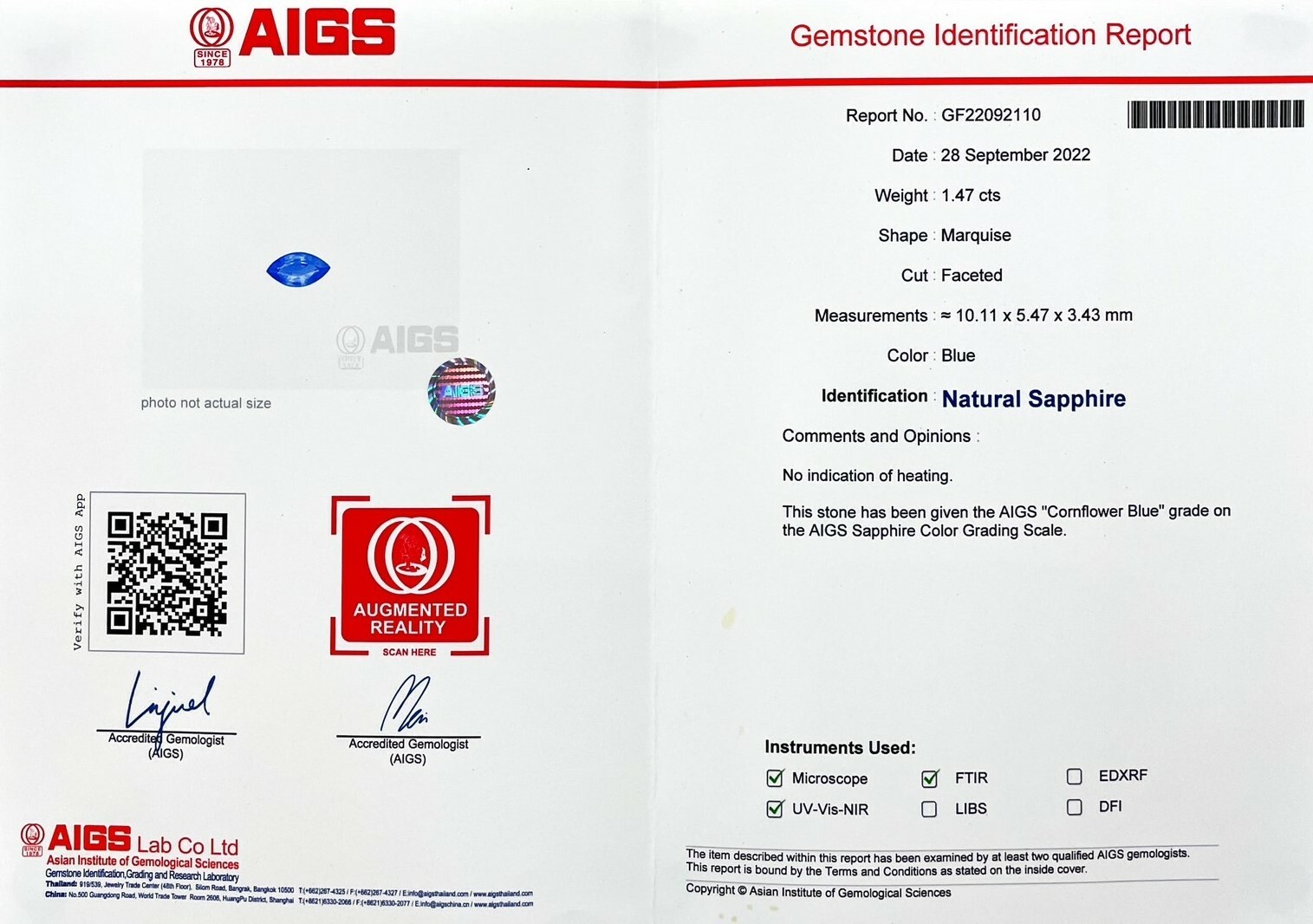 藍寶石|Sapphire▴ 重量:1.47ct (10.11*5.47*3.43mm)▴ 顏色:矢車菊|Cornflower▴ 證書: AIGS證書|國際證書▴ 處理:無處理| No treatment