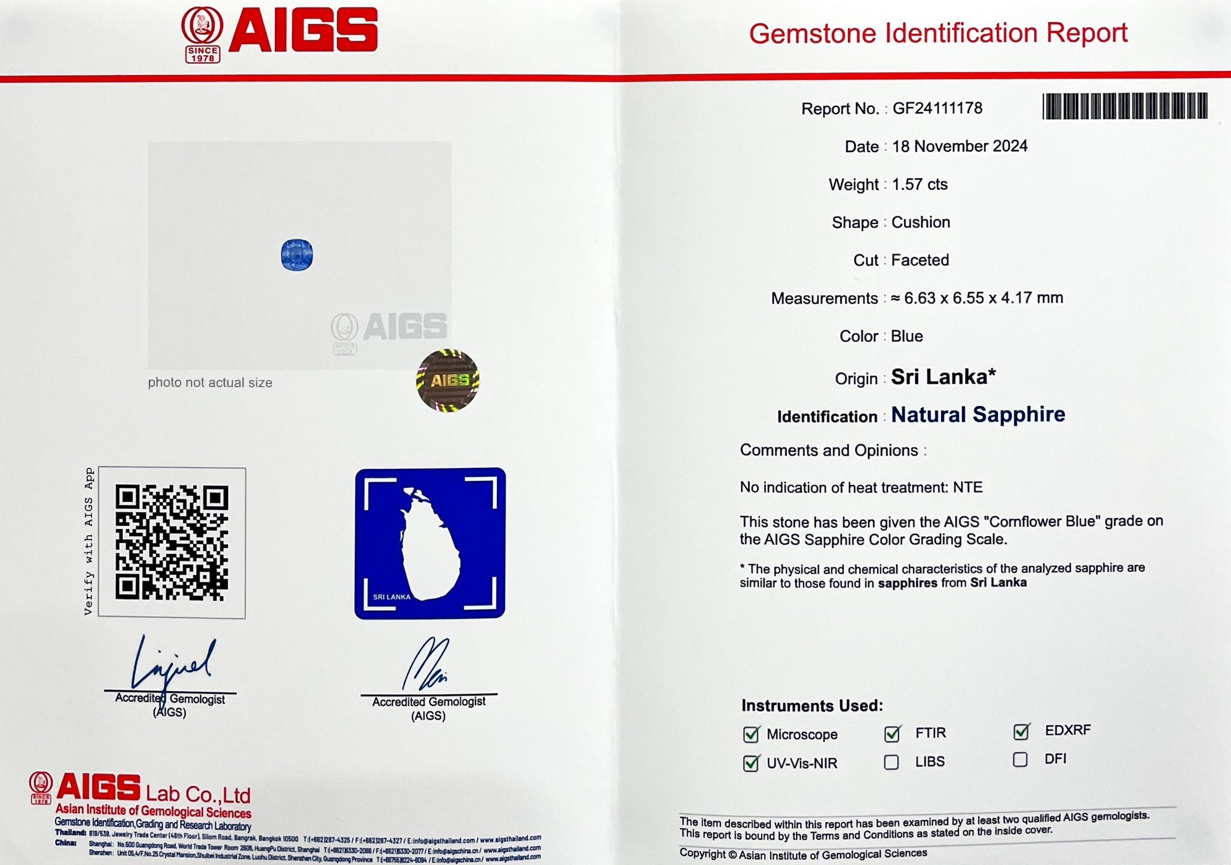 藍寶石|Sapphire▴ 重量:1.57ct (6.63*6.55*4.17mm)▴ 證書: AIGS證書|國際證書▴ 處理:無處理| No treatment▴ 產地:斯里蘭卡▴ 顏色:矢車菊 Cornflower
