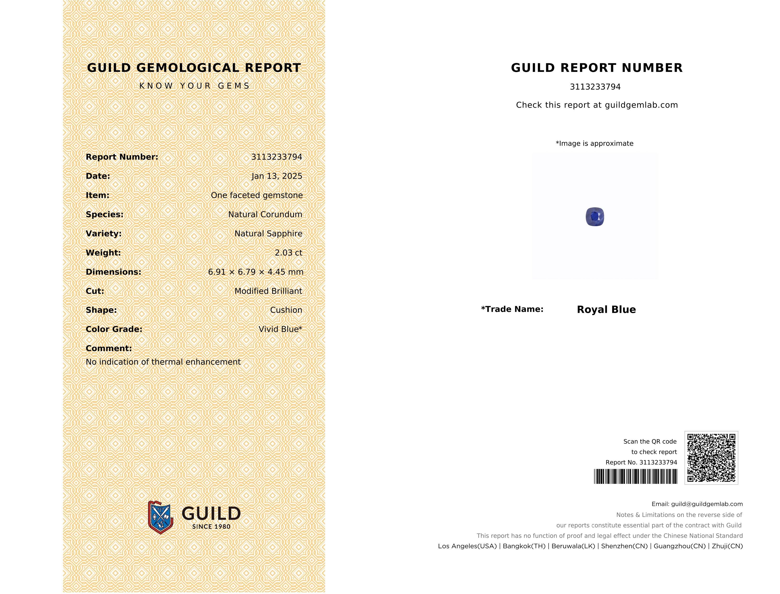 藍寶石|Sapphire▴ 重量:2.03ct (6.91*6.79*4.45mm)▴ 證書:GUILD國際證書▴ 處理:無處理| No treatment▴ 顏色:皇家藍 Royal Blue