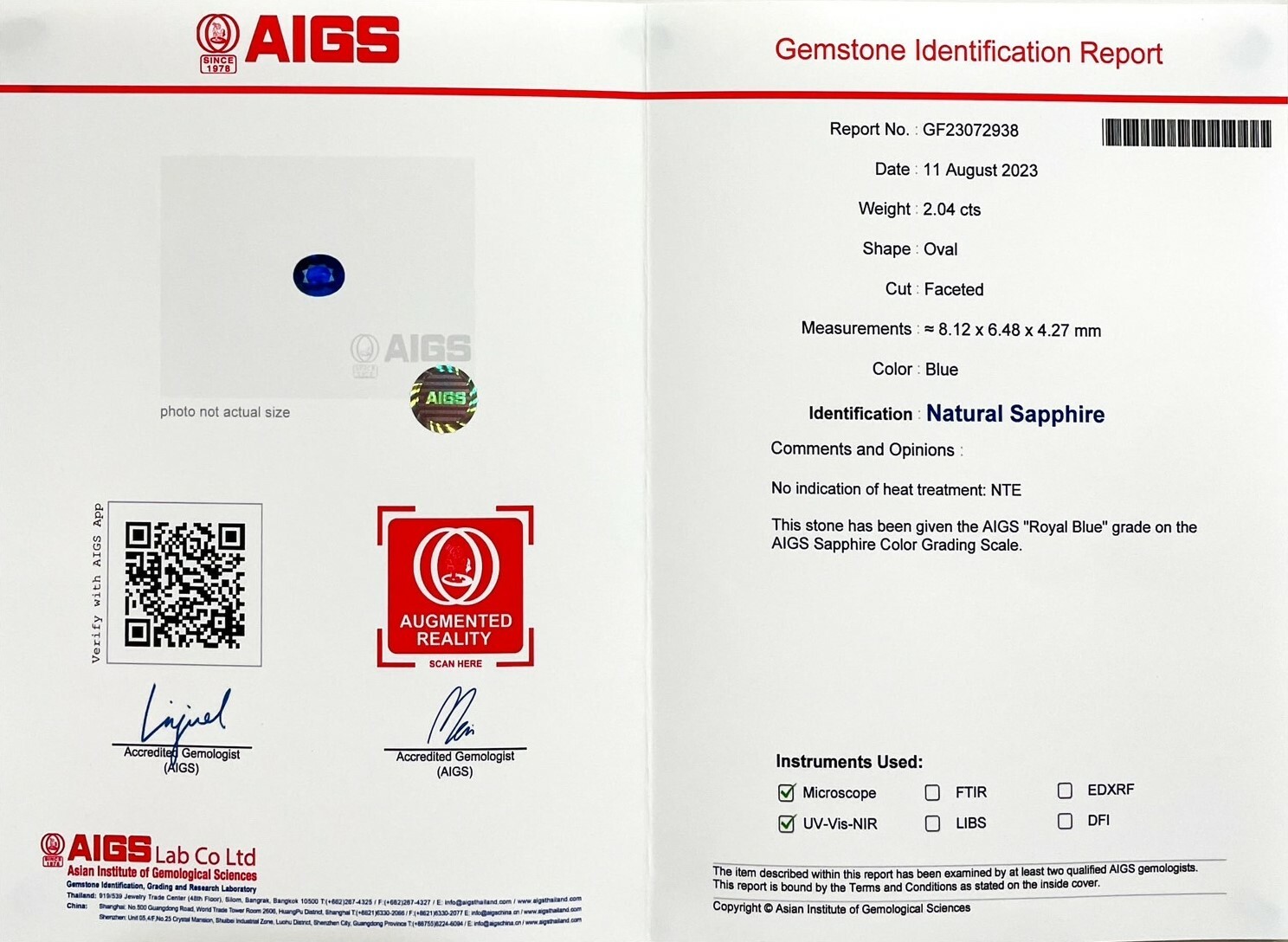 藍寶石|Sapphire▴ 重量:2.04ct (8.12*6.48*4.27mm)▴ 顏色:皇家藍|Royal Blue▴ 證書:AIGS證書|國際證書▴ 處理:無處理| No treatment