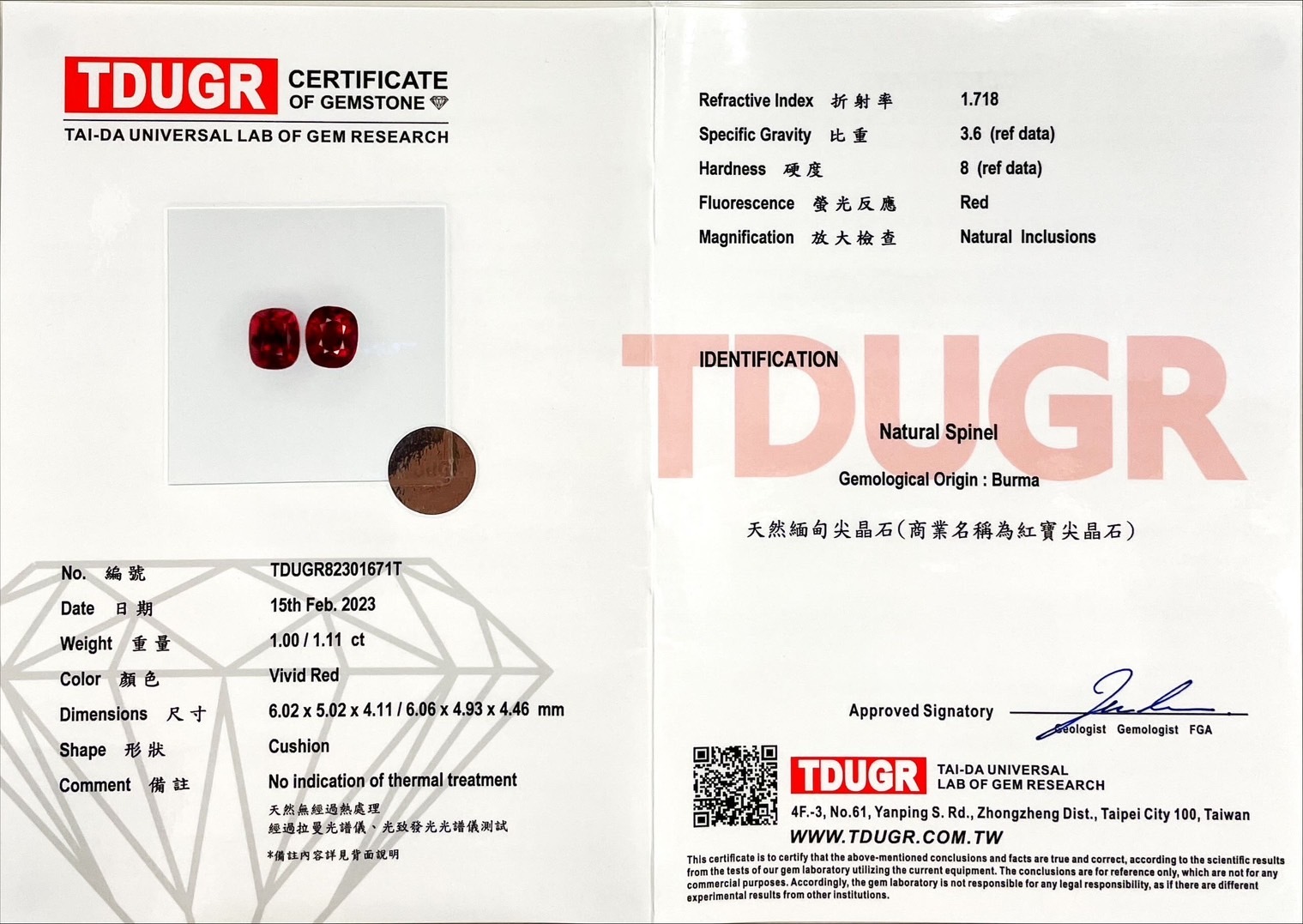 紅寶尖晶|Spinel▴ 重量:1.00ct / 1.11ct pair▴ 顏色:豔紅色|Vivid red▴ 處理:無處理|No treatment