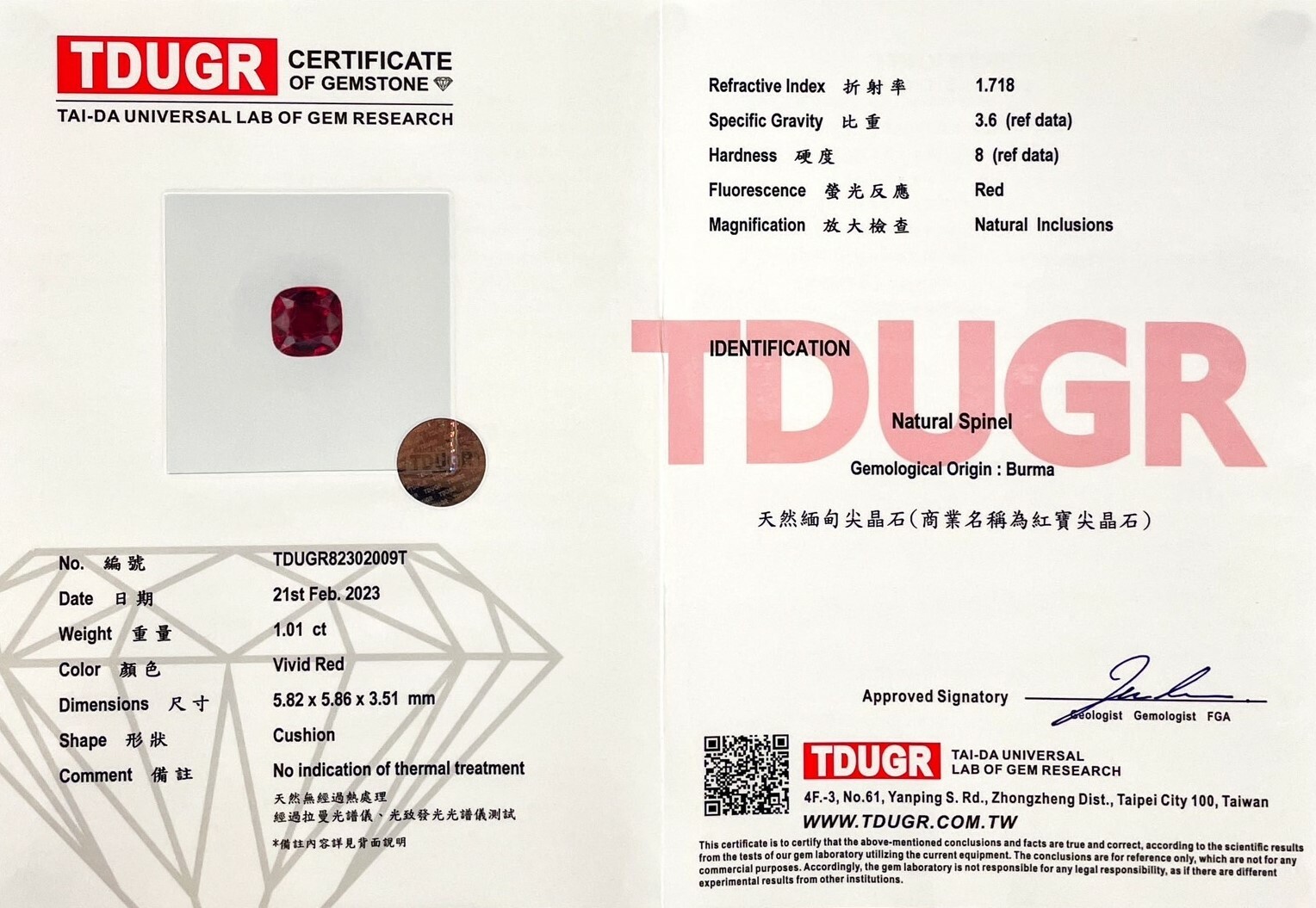紅寶尖晶|Spinel▴ 重量:1.01ct (5.82*5.86*3.51mm)▴ 顏色:正紅色