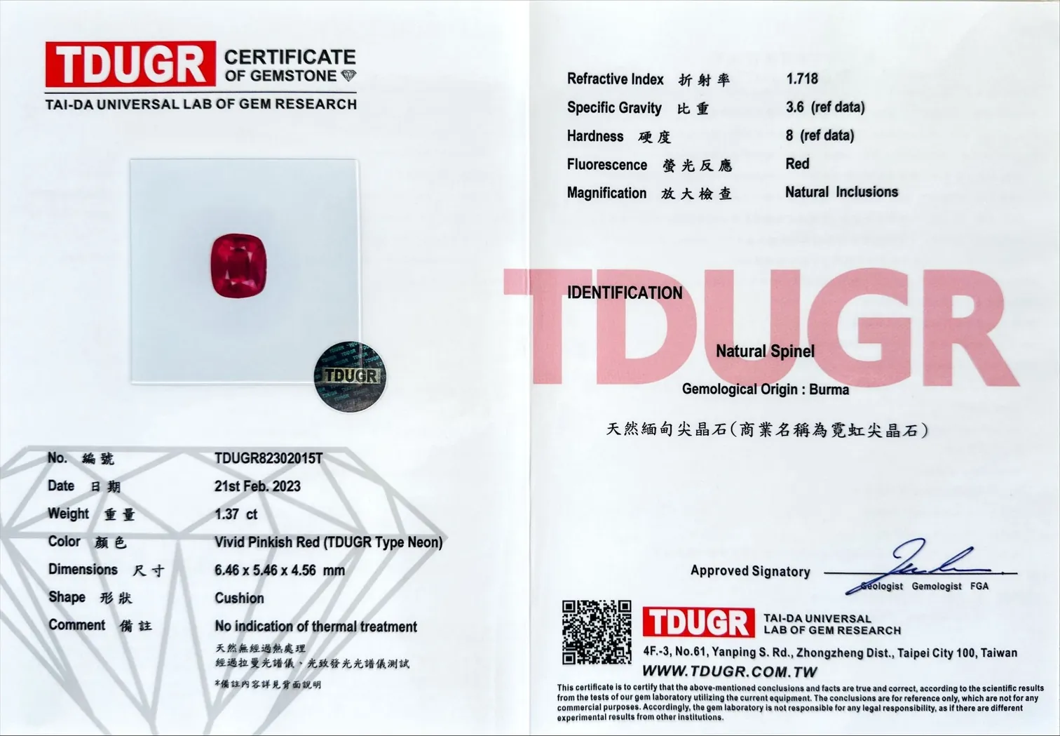 霓紅尖晶|Spinel▴ 重量:1.37ct (6.46*5.46*4.56mm)▴ 顏色:霓紅色