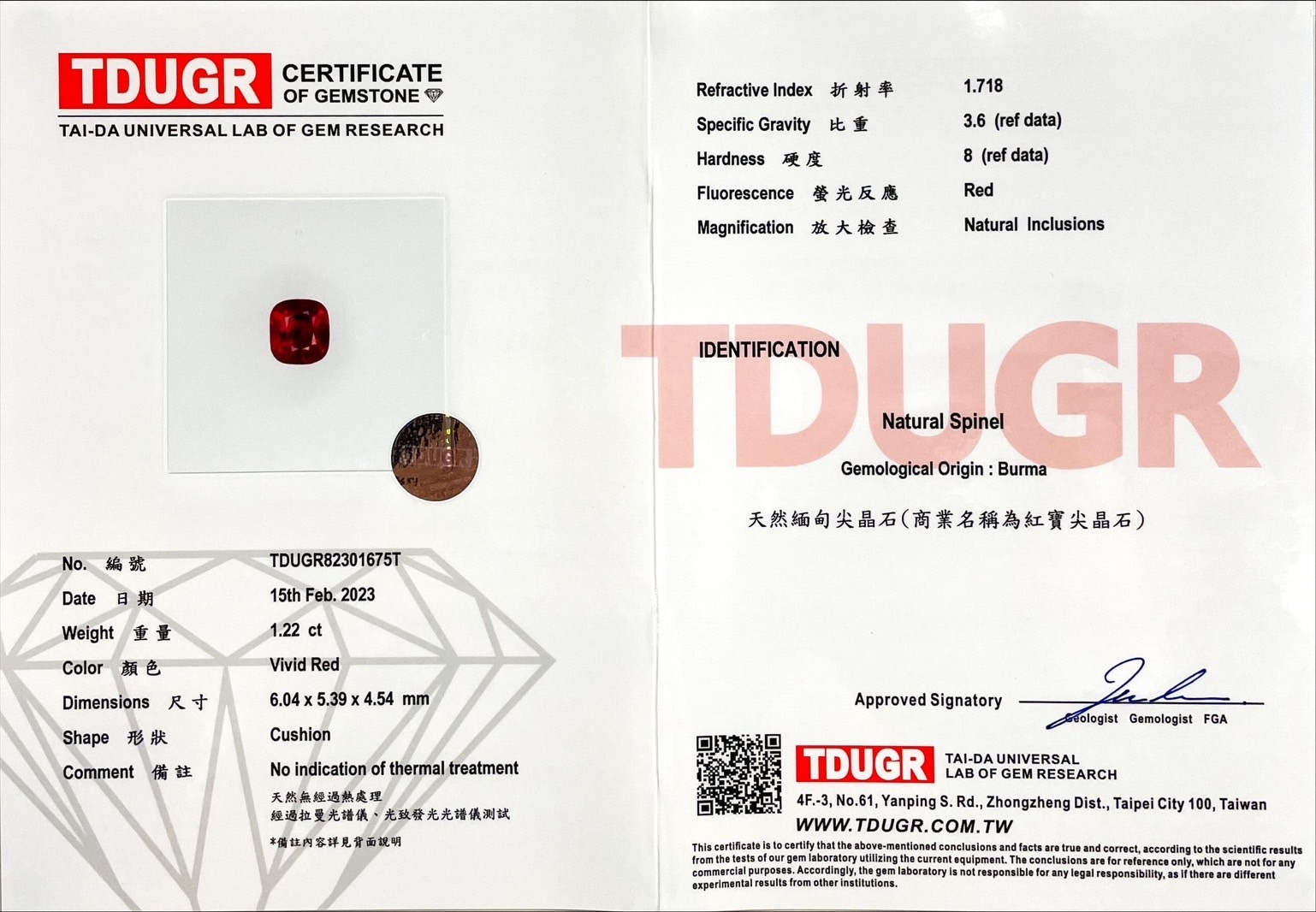 紅寶尖晶|Spinel▴ 重量:1.22ct (6.04*5.39*4.54mm▴ 顏色:豔紅色|Vivid red