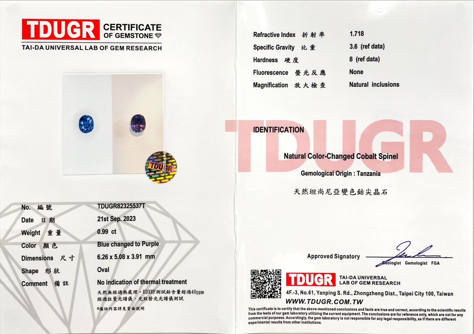 變色鈷尖晶|Cobalt Spinel▴ 重量:0.99ct (6.26*5.08*3.91mm)▴ 顏色:藍色紫色