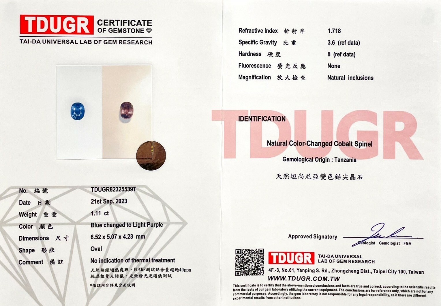 變色鈷尖晶|Cobalt Spinel▴ 重量:1.11ct (6.52*5.07*4.23mm)▴ 顏色:藍色紫色