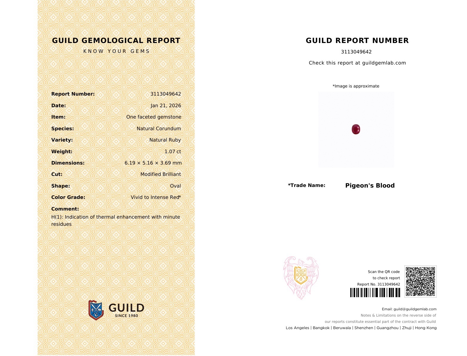 紅寶石|Ruby▴ 重量:1.07ct (6.19*5.16*3.69mm)▴ 顏色:鴿血紅 |Pigeon Blood